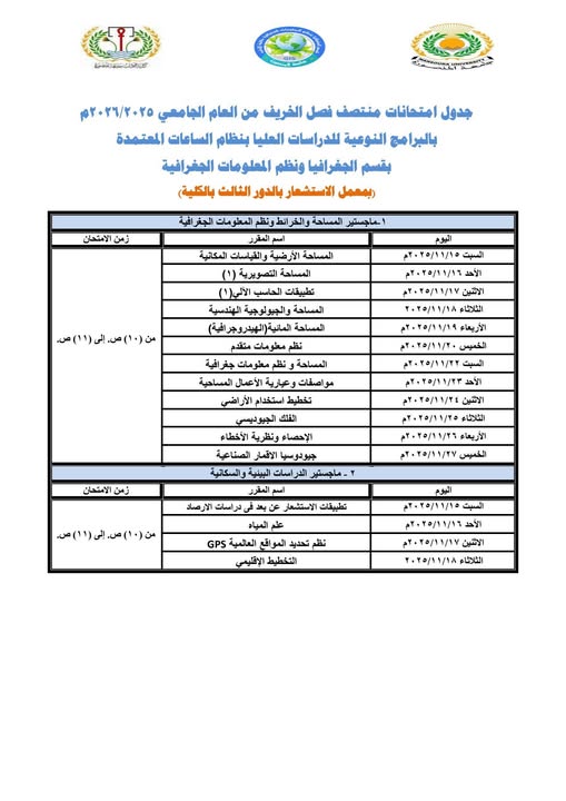 Previous Next 13 نوفمبر,2025 جدول امتحانات منتصف فصل الخريف من العام الجامعي 2025/2026م طلاب الدراسات العليا جدول امتحانات منتصف فصل الخريف من العام الجامعي 2025/2026م بالبرامج النوعية للدراسات العليا بنظام الساعات المعتمدة بقسم الجغرافيا ونظم المعلومات الجغرافية (بمعمل الاستشعار بالدور الثالث بالكلية) التالي