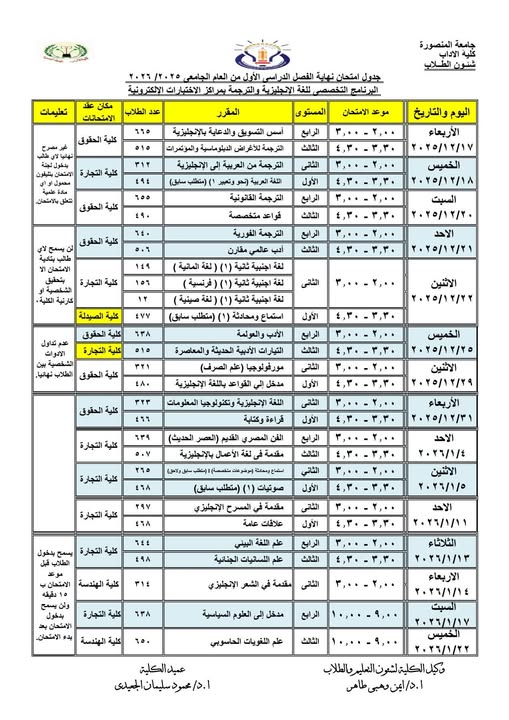 Previous Next 16 ديسمبر,2025 جدول امتحانات البرنامج التخصصي للغة الإنجليزية والترجمة نهاية الفصل الدراسي الأول دور يناير ٢٠٢٦ للعام الجامعي ٢٠٢٥ - ٢٠٢٦ هام وعاجل جدول امتحانات البرنامج التخصصي للغة الإنجليزية والترجمة نهاية الفصل الدراسي الأول دور يناير ٢٠٢٦ للعام الجامعي ٢٠٢٥ - ٢٠٢٦ السابق التالي