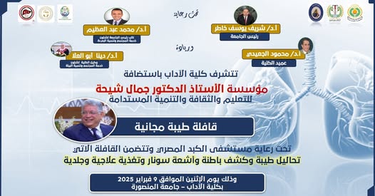 Previous Next 12 فبراير,2026 قافلة طبية من مستشفى الكبد المصرى وجمعية رعاية مرضى الكبد بالدقهلية تستضيف كلية الآداب جامعة المنصورة قافلة طبية من مستشفى الكبد المصرى وجمعية رعاية مرضى الكبد بالدقهلية السابق التالي